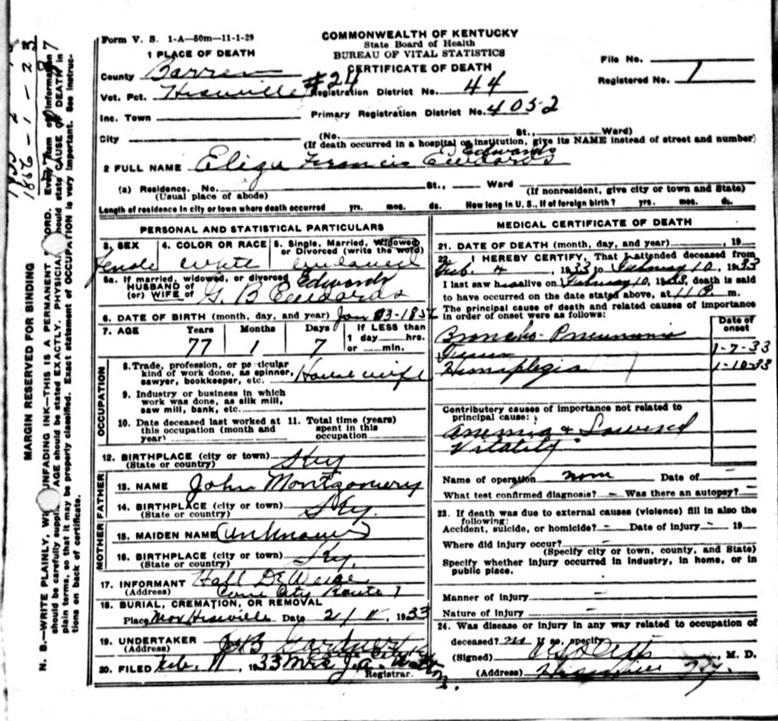Article provided by Dr. Gary Lee Bastin (Edith's son) who has researched this family line. Kentucky’s Lt. Governor James G. Hardy is buried in the Edwards Cemetery, Barren County, Kentucky. In 1854 he was elected Lt. Governor on the Know-Nothing Party ticket but died July 16, 1856 before completing his term. There was once a Hwy Marker located in the edge of Hart County on Hwy 31-E at the Bear Wallow-Seymour Road. The marker was hit and knocked down by an automobile in the 1970s or 1980s. The highway marker laid on the road side for years but has never replaced by the Highway Department. Here is Lt. Governor James G. Hardy’s obituary: Tri-Weekly Commonwealth Newspaper 25 July 1856 Issue "Death of Lt. Governor Hardy. At half-past 12 o'clock on Wednesday night, July 16th, 1856, JAMES G. HARDY, Lieutenant Governor of the State of Kentucky, died at his residence in Glasgow, Ky., and was carried to his farm in the country and interred in the family burying grounds on Thursday evening. Major Hardy was born in Lunenburg county, Virginia, on the 3d day of May, 1795, and was, consequently, in his 62d year, when he died. He had a large family, and left a widow and ten living children to mourn his death. He had, during his life, been frequently elected to the State Legislature, by the force of his personal popularity. For although Barren county has for many years had a majority of Whigs, he has often been elected as a Democrat. When the American movement reached this part of the country, he united himself with, and at once became a prominent member of that party. In 1855 he was nominated as the American candidate, and elected Lieutenant Governor of Kentucky. Soon after the beginning of the session of the last Legislature, he was attacked with an affection of the brain, from which he never recovered, and of which he died. |