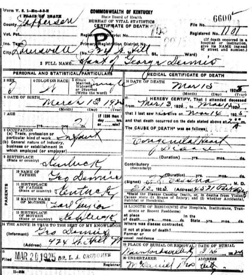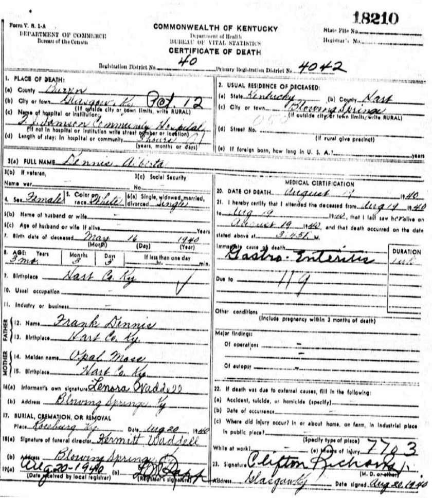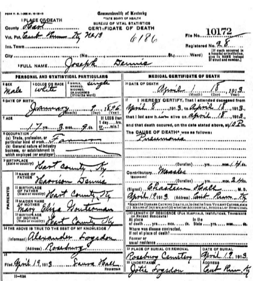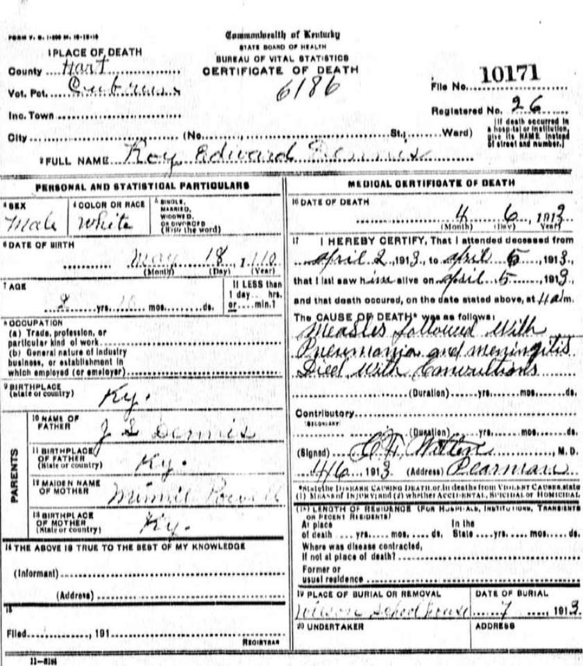 | *Dennis, Robert Luther. KY Death Index lists him as Robert R. There is suppose to be a tombstone for him with him listed as Luther. His dates differed from what is listed on his DC. S\o George & Sallie Taylor Dennis. |