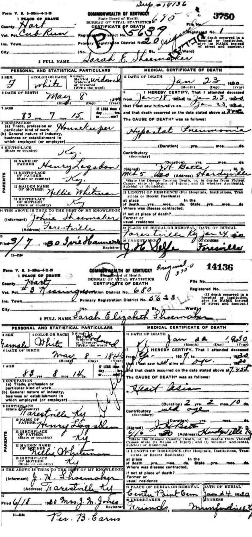| S\o William H. Vass & Mary Wagner Note..on W. D’s brother D. C. Vass…I think it’s really R. G. Vass. I found his DC…says b. Nov. 1874, d. 1943 – but the informant was a Mary Hensley and she gave his father’s name as W. E. Vass (instead of W. H.)..mother unknown. Buried in the “Family Cemetery”. There are a family of Vass buried in one of the Harper Cemeteries in Hart Co….this Harper Cemetery is aka: Harper, Old Soldier’s, Leitchfield. None of this fits for D.C. Vass. R. G. is buried in the “Family Cemetery” which tells me he’s buried in Harper\Leitchfield. So..DC in Centerpoint would – or should not be R. G. I can find nothing else on DC at this time. - CPO |