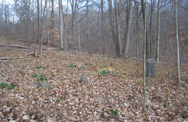 DEFEVER BURIAL SITE NEAREST TOWN IS JONESVILLE (HART COUNTY), KENTUCKY LOCATION: On Hwy 31E at Jonesville, turn East onto Hwy 936. Travel 4.0 miles, then turn right onto Parker Road (Hwy 1037). After a very short distance on gravel, the road becomes a private, dirt drive and ends after 1.3 miles at the mobile home of Tim Hawkins. COMMENTS: The cemetery is behind and to the right of the mobile home at the edge of the woods. There are six burials visible. Five are marked with stones; only one has an actual tombstone. Photos and information provided by Dee Tapp |