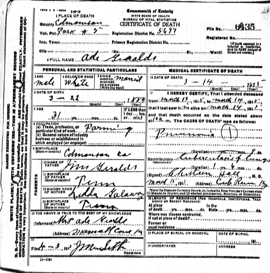 This Cemetery is located approximately five miles South of Cub Run on the northern edge of Mammoth Cave National Park on Little Jordan Road in Edmonson County, Kentucky. During Elige ‘Lige’ Geralds’ life time he owned 120 acres behind this cemetery. Probably the best time to visit his old home place and the cemetery is in the spring when the March Lillies are in bloom. I'm sure they had a bunch of them as everybody did back in those days.