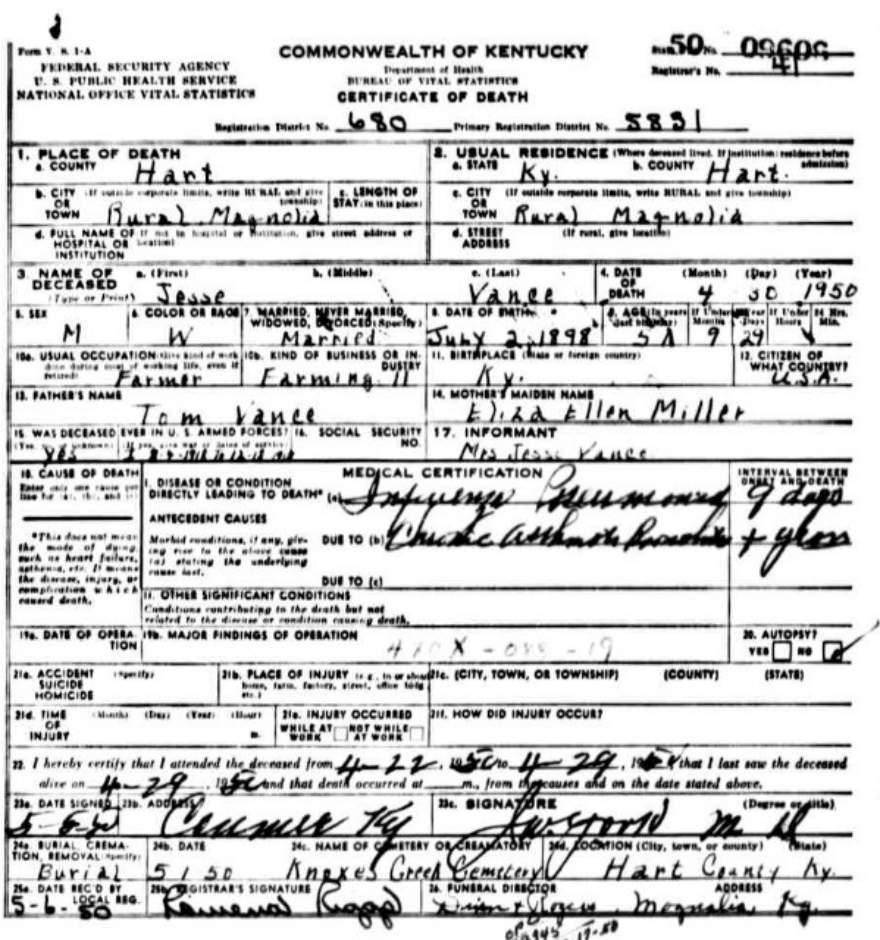 Knoxes Creek Cemetery Hart County, Kentucky Located off highway 566 on Knox Creek Road near Linwood. Knoxes Creek Church is on 566 (Eve Road), the cemtery is behind the Church. Information & Transcription provided by Death Certificates provided by |