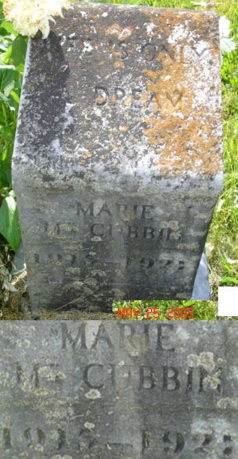 “Life is only a dream” - Hart Co KY Cemetery Records Vol. 2 presented by Sandi Gorin July 1993, page 75 lists Marie McCubbin b. Mar 3, 1918 and d. Aug 11, 1918. |