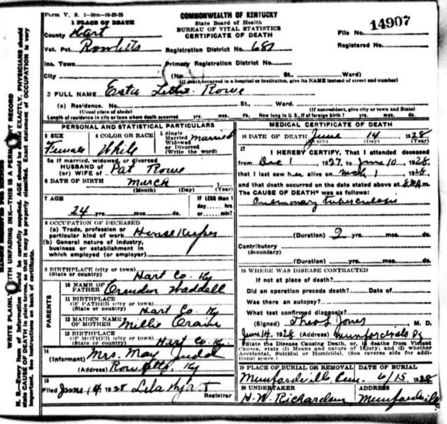 11. KYDI: ROWE PATRICK H 060 HART HART 11-05-1959 048 23508 -- 1930 Census: Rowe, Patrick H Age: 31 Year: 1930 Birthplace: Kentucky Roll: T626_749 Race: White Page: 3B State: Kentucky ED: 4 County: Hart Image: 0853 Township: Munfordville Relationship: Lodger