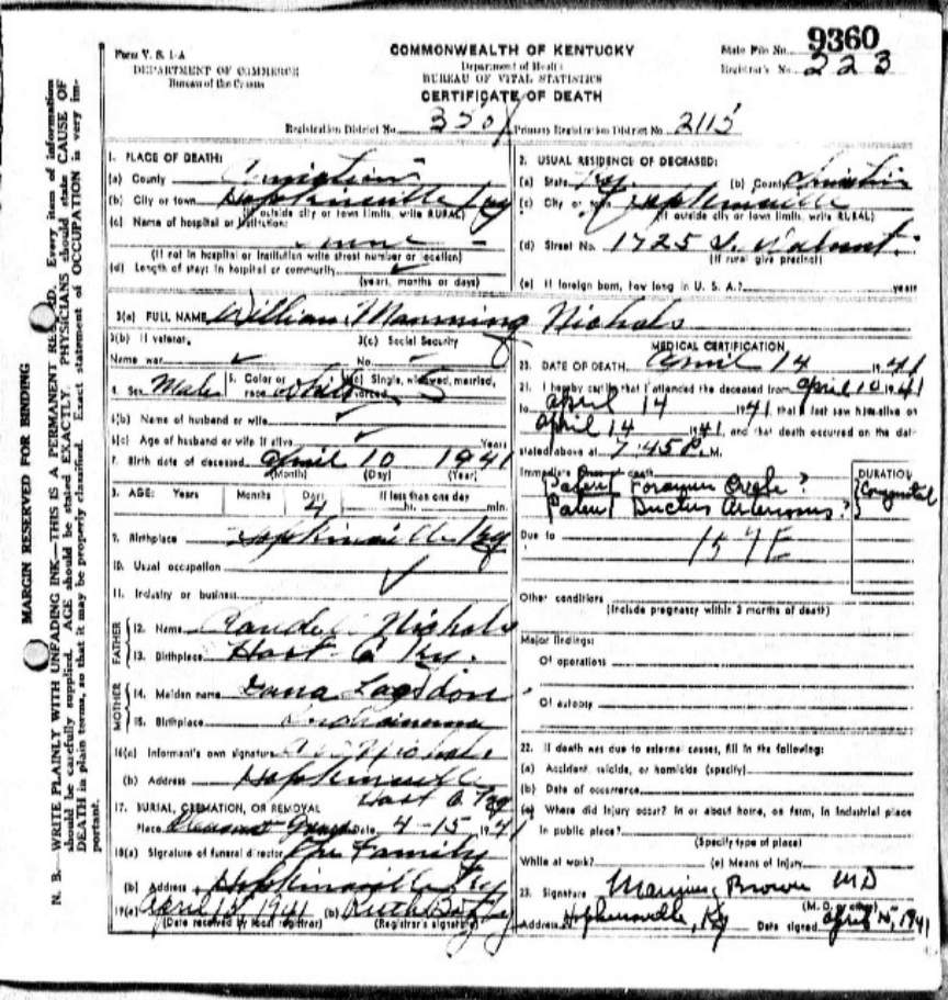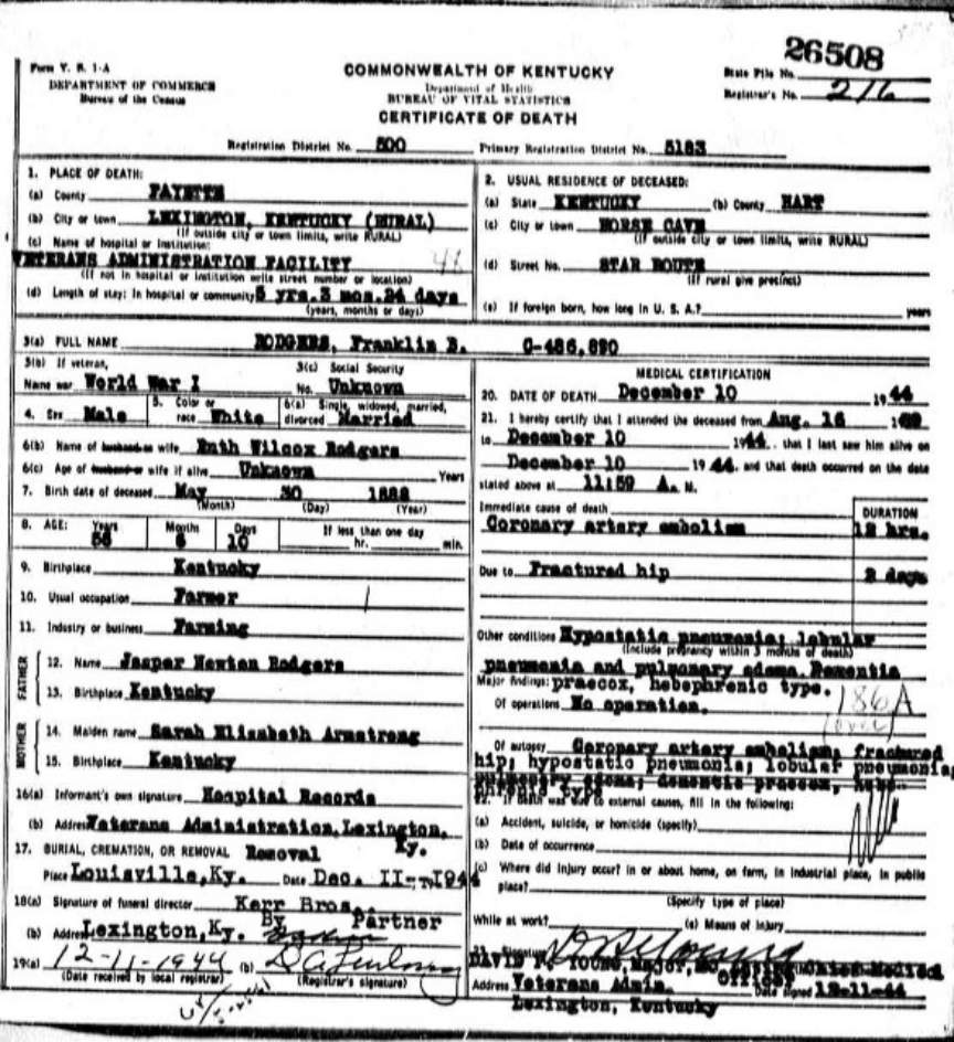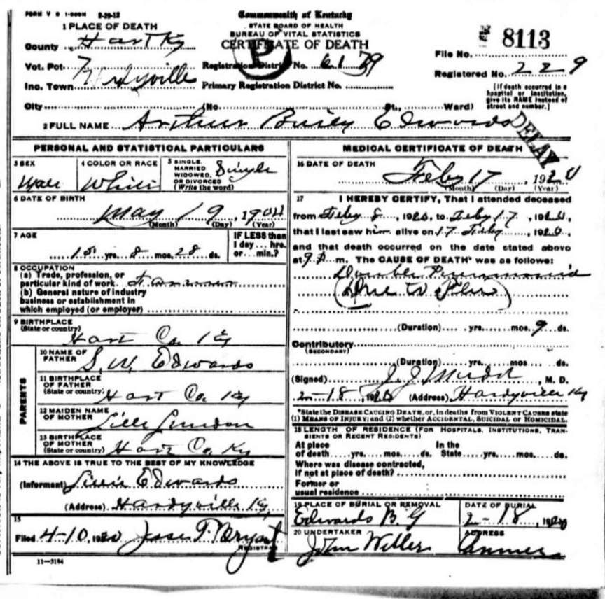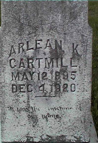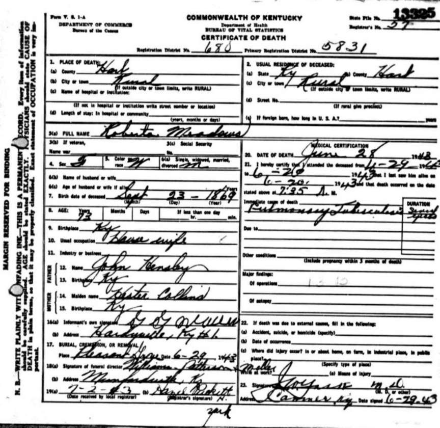 | 1. Crabtree, Mary Ann Dnuagan note: Grandson of Sarah (Sallie) Walton and Squire Broady. 2. KYDI: BROOKS CORINA 083 BARREN HART 09-11-1956 040 19558 1956 3. KYDI: DAVIS W E 043 HART 07-02-1914 012 05635 1915 4. KYDI: EDWARDS ARTHUR B 015 HART 02-17-1920 017 08113 1920 5. Our Children: Donna M., Timothy J. -- m. 07-13-1945 6.KYDI: HAMBLIN MARILYN J 057 HARDIN HART 03-07-1998 015 07129 1998 7. KYDI:WITHERSPOON THOMAS G 087 HART 08-10-1932 038 18939 1932 8. It is my opinion that most of the information on this stone is incorrect. I'm told and believe that this is my great grandfather and great-grandmother, William David and Vermont(ie) Green Bryant. Information from death certificates and census differ from the gravestone. 9.Harriet Lee Hensley (d/o Samuel Monroe Hensely & Minerva Jane Huff) b. 11/11/1853 in Hart Co., KY and d. 12/4/1904 in Hart Co. married 12/15/1869 in Hart Co., KYL(orenzo) Willis Tucker (s/o Eppes Tucker & Lucinda Webb) b. 7/14/1848 in Hart Co., KY and d. 5/15/1929 in Hart Co., KY. His 2nd wife, Nannie/Nanny Murray was d/o Richard Murray & Mary Jane Shipp and was b. 5/16/1865 in Hart Co., and d. 2/24/1931 in LaRue Co., KY buried Pike View Cemetery, Hart Co., KY.(KBC) 10. Samuel M(onroe) Hensley (s/o David Lewis Hensley & Mary Foster), was m. to Minerva Jane Huff. He was b. 10/1/1827 in Henry Co., VA and d. 7/11/1883 in Monroe, Hart Co., KY.(KBC) 11. Epps (aka Eppes) Tucker was s/o Pascal Tucker & Mary Pentecost. He was b. 1/16/1809 in Green Co., KY and d. 2/18/1880 in Green Co., KY.(KBC) 12. Lucinda Webb was d/o Amasa Webb & Elizabeth Springer. She was b. 10/22/1814 in KY and died 3/14/1979 in Green Co., KY. Epps and Lucinda married abt. 11/22/1838 and had 9 children total that I know of(KBC). 13.Daughters of Epps & Lucinda: One is unnamed and was b. 11/12/1855 and d. 9/13/1856. Louanna was b. 7/12/1857 and d. 9/22/1860. Buried side-by-side in Pleasant Grove.(KBC) 14. Henry Jake Cartmell (aka Cartmill; s/o Wm. Thomas Cartmill & Mildred Catherine Lemmon) b. 9/9/1866 in Osceola, Green Co., KY d. 5/7/1946 in Monroe, Hart Co., KY(KBC) 15. Florence Emma Tucker (d/o Lorenzo Willis Tucker and Harriet Lee Hensley) b. 11/19/1871 in Hart Co., KY and d. 12/12/1937 in Monroe, Hart Co., KY. They married 1/5/1888 and had 5 children that I know of.(KBC) |