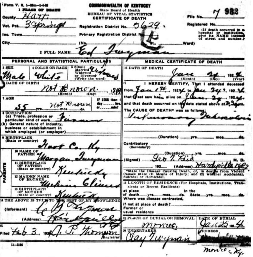 Riordan Cemetery Hart Co., KY Located on the Riordan Cemetery Road off the Pascal Fairview Road N 37º 13.531' - W085º 44.534' Transcription of dates & notes Death Certificates |
