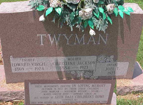 Infant” - SSA: Christina Jackson, Edward Virgil - “These monuments erected in loving memory Oct 8, 1972 by their other children: John Morgan, Woodrow Wilson, Frank, Mabel, Colvin, Edward, Virgil Jr." - "All raised at Glendale Orphan’s Home. They now reside in San Diego Beach and Livingston, Tennessee.” | |