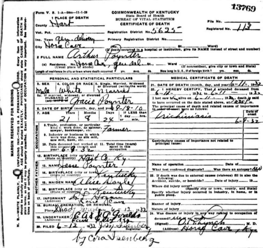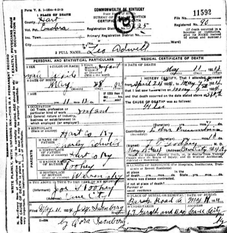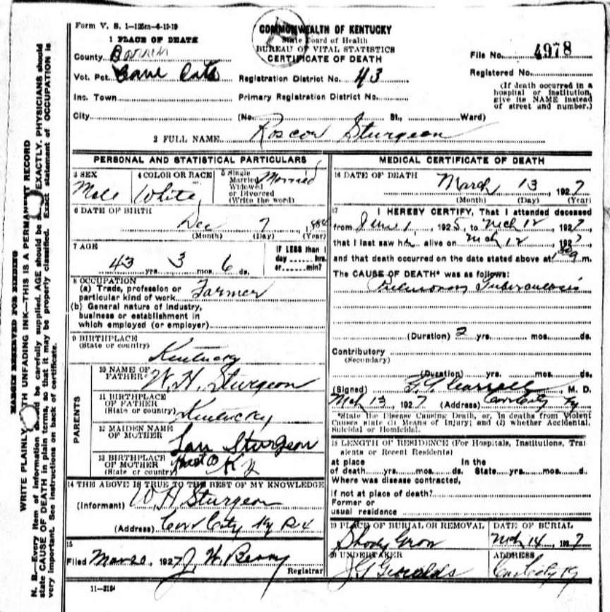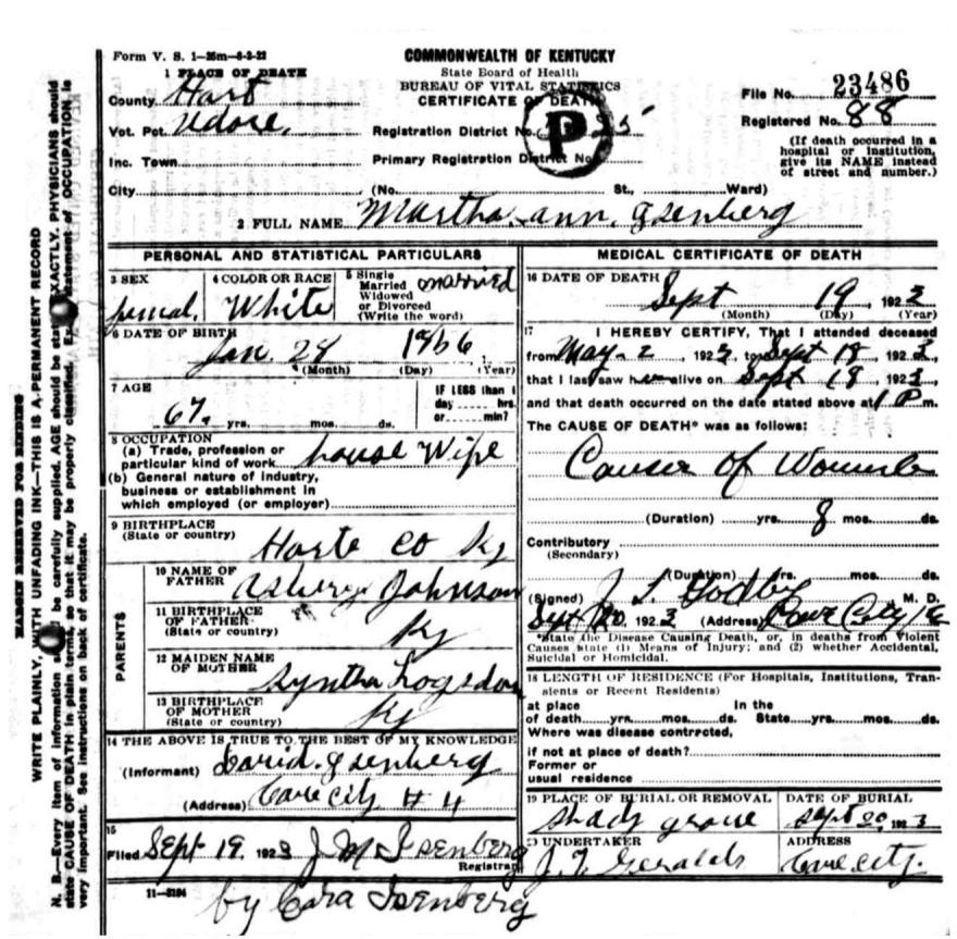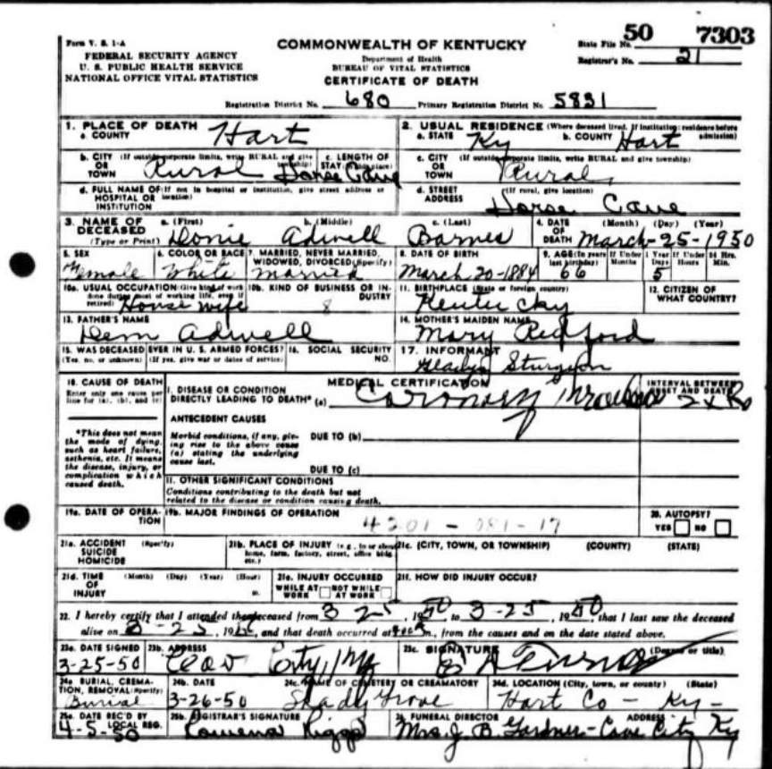 Hart Co KY Cemetery Records Vol 2 of Judge Cann’s Records by Sandi Gorin pg. 38 lists birth 15 Oct 1881 and death date 13 July 1940. |