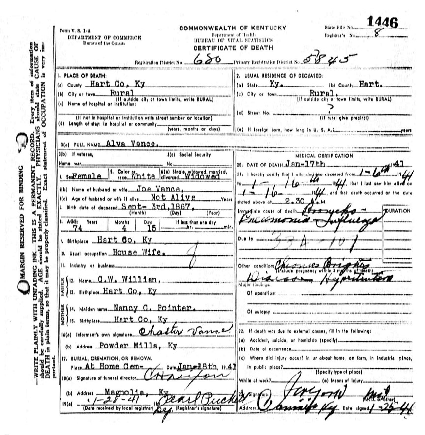 VANCE FAMILY CEMETERY Perkins Cemetery Road , Hart County, Kentucky LOCATION: On Hwy 31E in Linwood, Hart County, Kentucky turn East onto Hwy 569 ( Powder Mills Road) and proceed 2.2 miles. Turn left onto Hwy 1030 ( Perkins Cemetery Road) and proceed 0.7 miles. Turn left immediately after passing a mobile home in front of an abandoned house. Drive into a field straight ahead 0.1 miles to the burial grounds in a grove of trees. COMMENTS: There are six large stones in good condition in a very poorly maintained plot, although some effort has been made recently to clear away the larger trees. The cemetery is on property owned by Gladys Vance Logsdon. Iinformation and death certificates provided by