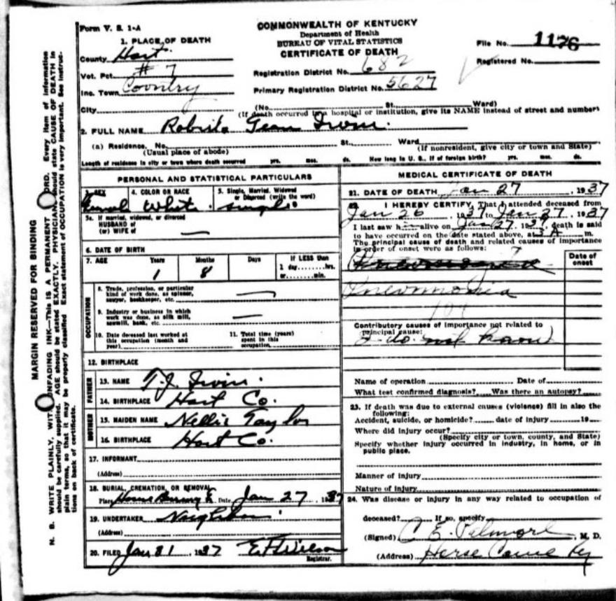 | Stewart, Flossie | Sanders | Barren | 11/2/1918 | C. Olney | Center Point | |||
