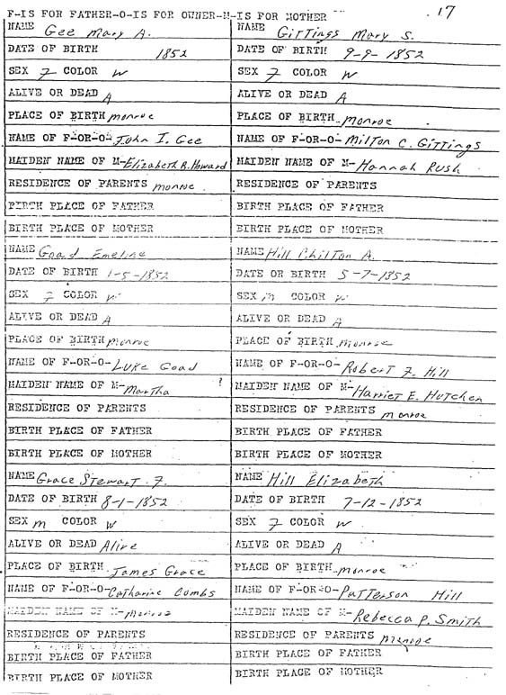 Gee, Gittings, Goad, Groce, Hill, Howard, Hutchen, Rush, Smith |
