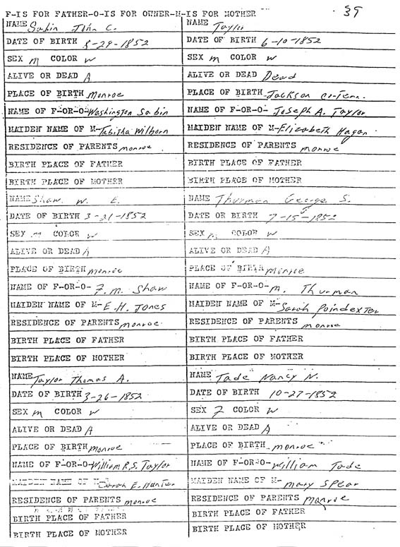Hunter, Jones, Poindexter, Sabin, Shaw, Spear, Tade, Taylor,