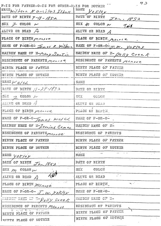 Creek, Sartin, Welch, Wilborn, Yokley |