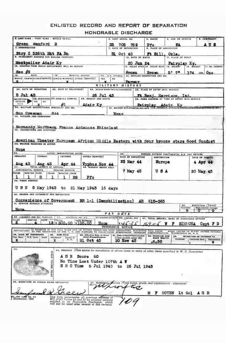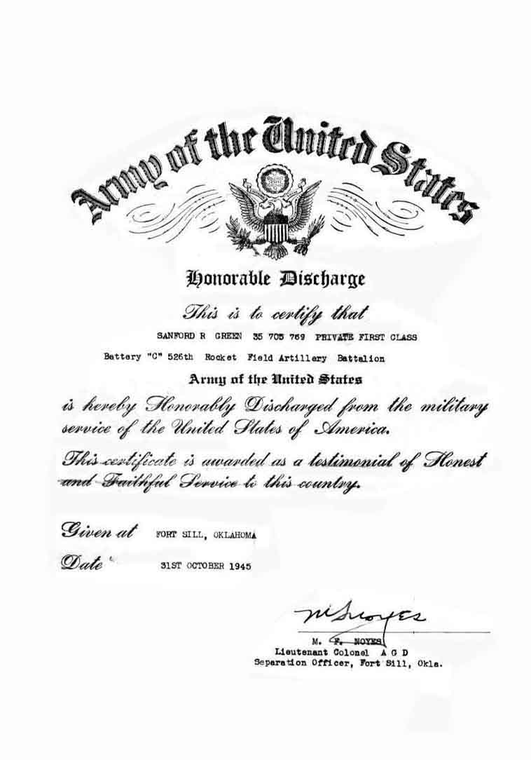 7-5-1943. Date of discharge, 10-31-1945. His military occupational