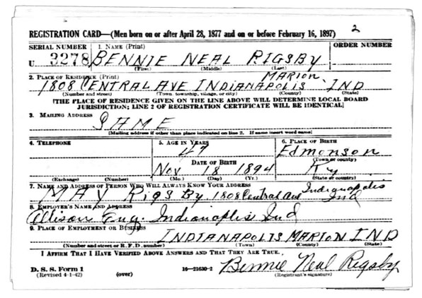 | Rigsby, Bennie | WWI | Draft Card | Sheila Wisdom-Hardin |