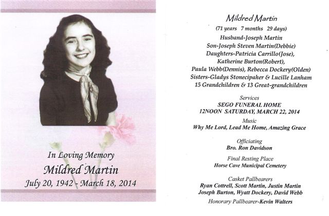 Funeral services for Mildred Martin will be 12noon CST Saturday in the chapel of Sego Funeral Home with burial in the Horse Cave Municipal Cemetery. Visitation will be Friday from 2-8pm CST and after 8am Saturday at the Sego Funeral Home. |