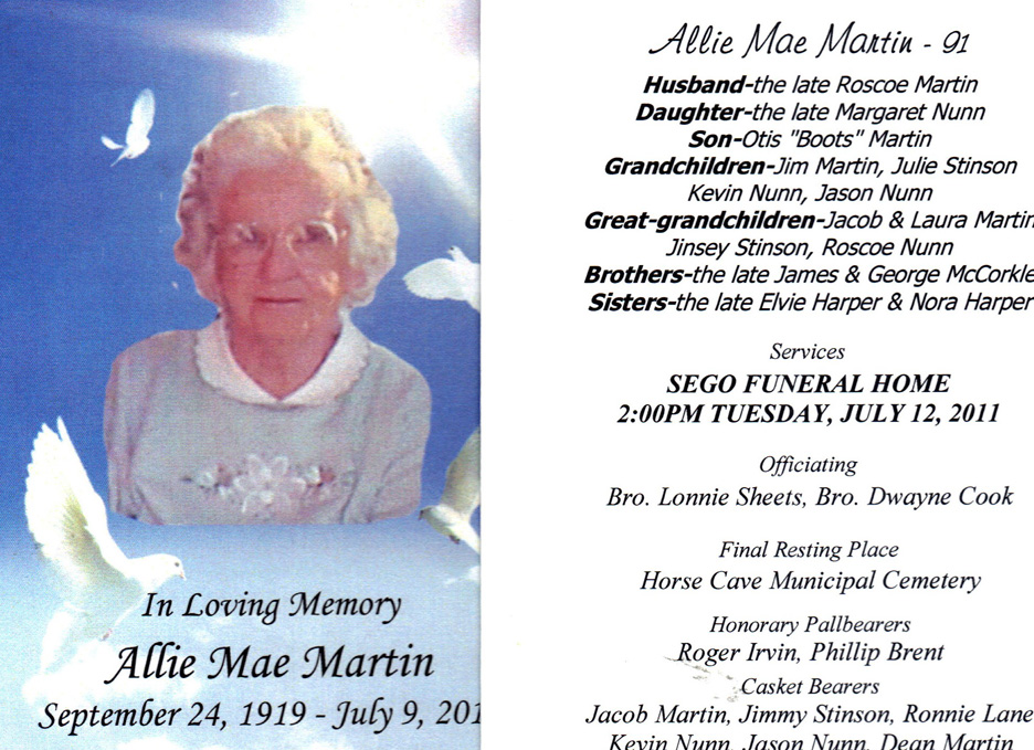 Funeral services for Allie Mae Martin will be 2pm Tuesday in the chapel of Sego Funeral Home with burial in the Horse Cave Municipal Cemetery. Visitation will be Monday from 2-9pm and after 8am Tuesday at the Sego Funeral Home.